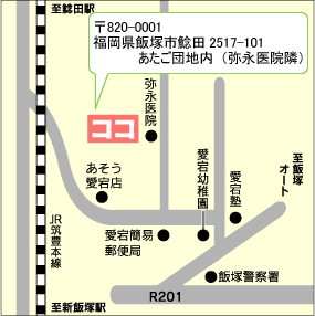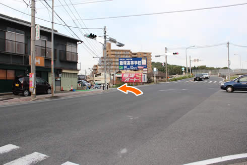 新飯塚駅近く、陸橋手前 五叉路をオートレース場方面へ。 陸橋越えて警察署方面からもアクセス可能(警察署方面からをご覧ください)