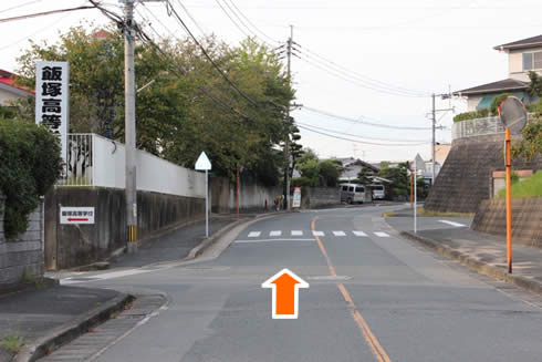 左手に飯塚高等学校の看板、あたご幼稚園が見えてきます。